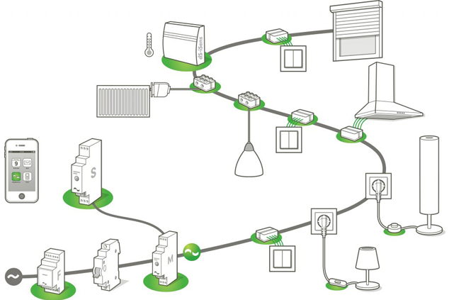 digitalSTROM setzt auf dezentrale Aktoren, die über die bestehenden Leitungen mit Tasterklemmen, Bedienelementen vernetzt und verknüpft sind. Dies vereinfacht die Umsetzung nicht nur bei bestehenden Installationen. Über den digitalSTROM Server lässt sich eine WLAN-Anbindung realisieren, so dass auch eine Bedienung mit einer Smartphone-App möglich wird. Mit dieser Verknüpfung in die Online-Welt entstehen wesentlich mehr Möglichkeiten zur Schaltung, Steuerung und Überwachung.