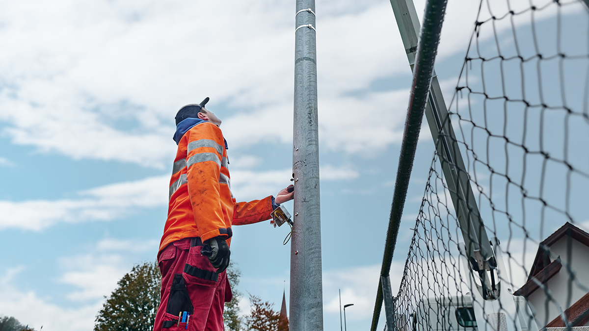 EM Licht koordinierte die sicherheitsrelevante Mastkontrolle und die Montage der Sportplatzbeleuchtung.