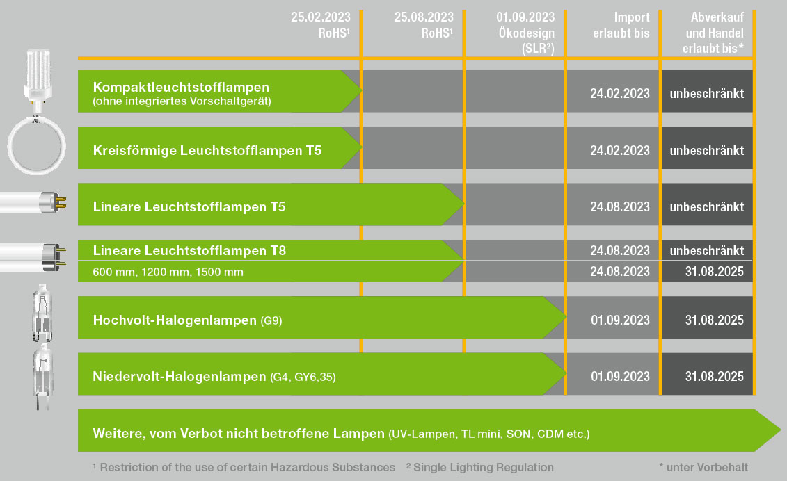 Mit der letzten Anpassung der RoHS-Richtlinie wurde die Ausnahmeregelung für Quecksilber geändert. Im Bereich der allgemeinen Beleuchtung betrifft diese Änderung in einem ersten Schritt (per 25. Februar 2023) die Kompaktleuchtstofflampen ohne integriertes Vorschaltgerät und die kreisförmigen T5-Leuchtstofflampen. Sechs Monate später (per 25. August 2023) folgen die linearen T8- und T5-Leuchtstoffröhren. Wie in der Grafik dargestellt, bleibt die Ökodesign-Verordnung per 1. September 2023 für Hochvolt-Halogenlampen (G9) und Niedervolt-Halogenlampen (G4 und GY6,35) unverändert.