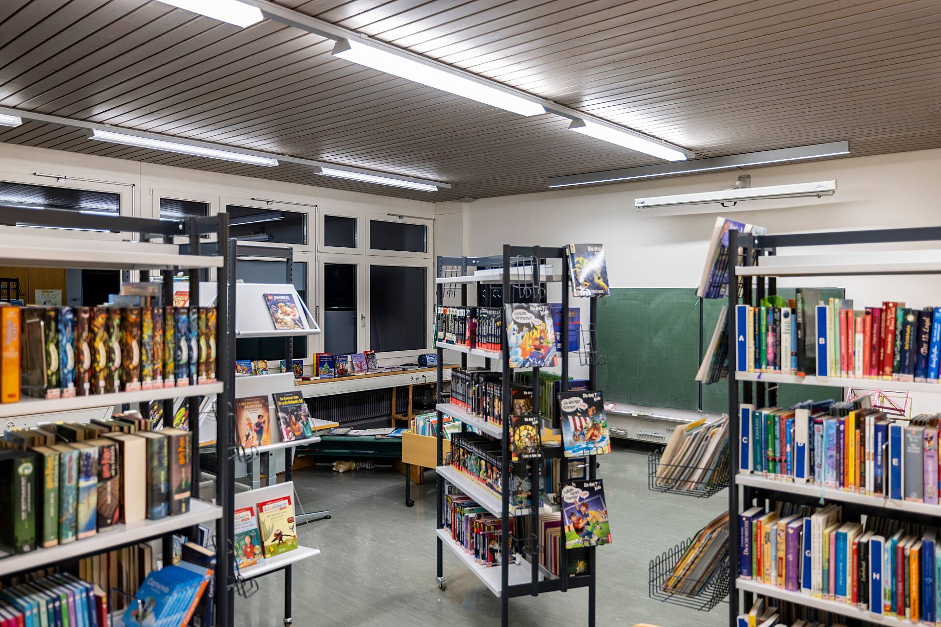 Um die gewünschte Lichtqualität zu erreichen, setzten die Lichtexperten von EM Licht eine speziell für den Arbeitsplatz konzipierte Leuchte ein: Die EM OfficeLine. Die DALI-fähige Leuchte wird an einem Schienensystem montiert und kann via Touch-Dim individuell gesteuert werden. Somit haben alle Schüler, egal ob am Fenster oder an der Wand, ideale Lichtverhältnisse zum Lernen.