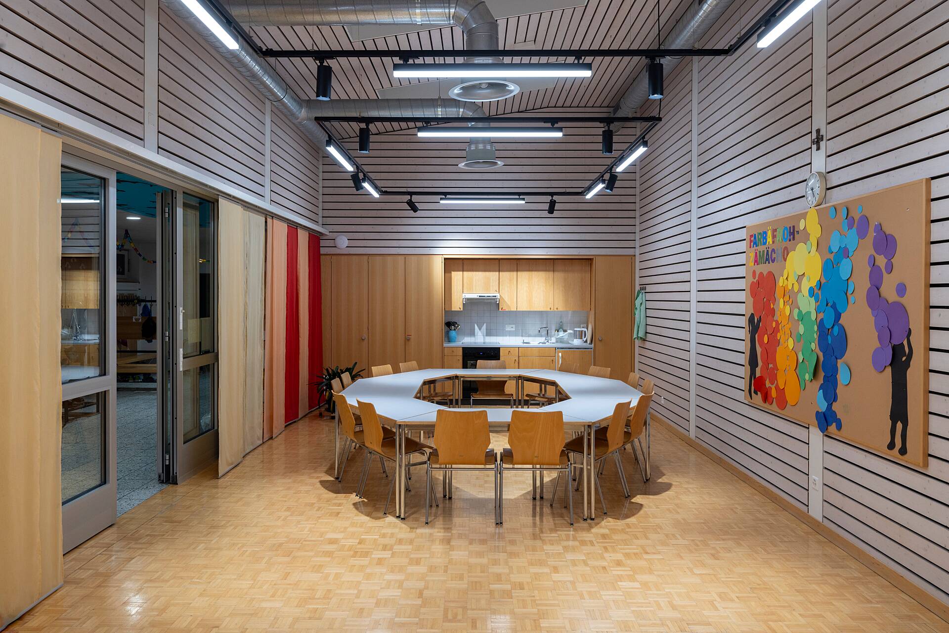 Roger Gisler, Lichtberater bei EM Licht, hat in enger Zusammenarbeit mit dem Elektriker und dem Hauswart der Schule eine Lösung erarbeitet, die Komfort und Effizienz vereint. Die Turnhalle wurde mit LED-Umrüstsets optimiert, die Korridore wurden mit neuen LED-Downlights bestückt, und die Schulzimmer erhielten mit einer speziellen Arbeitsplatzleuchte das passende Licht.
