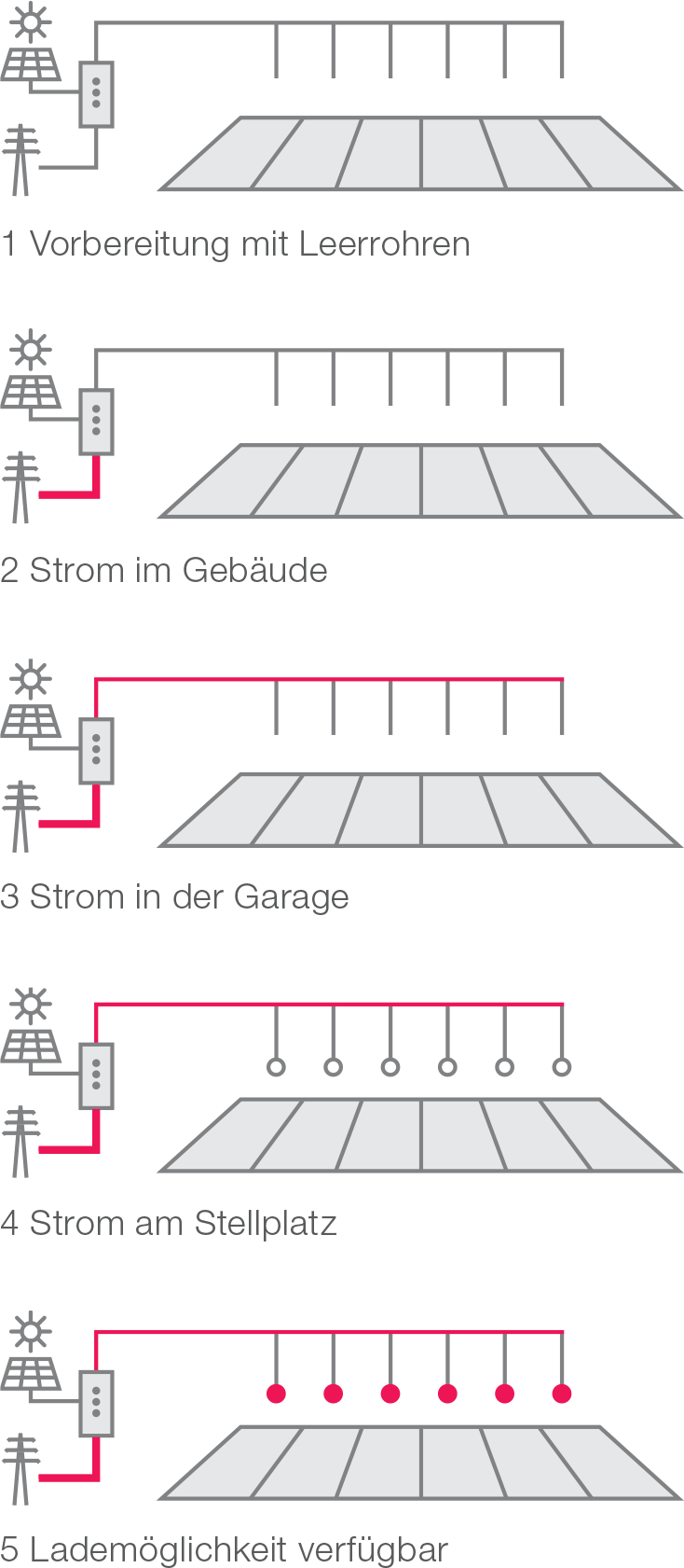 Bei der Planung von Gebäuden soll die Infrastruktur für Elektromobilität in Ausbaustufen berücksichtigt werden. Der Stufe 4 kann einfach entsprochen werden, indem CEE16-Steckdosen in Garagen/Einstellhallen installiert werden. Mit dieser Vorbereitung ist für die Inbetriebnahme nur noch die Ladeinfrastruktur erforderlich.