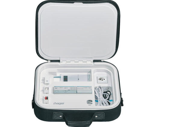 Hager bietet für die Konfiguration ein spezielles Inbetriebnahme-Set an, dass in einem handlichen Koffer verstaut ist. Heinz verbindet dies nun mit der gerade fertig gestellten Installation. Dann kann er in einem ersten Schritt alle Produkte automatisch suchen und einlesen lassen, bevor er sie beschriftet.