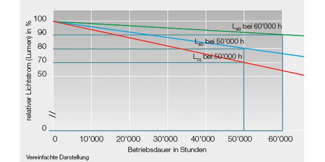 Schematische Darstellung des Lichtstromverlaufs über die Betriebszeit. Quelle: ZVEI-Leitfaden «Planungssicherheit in der LED-Beleuchtung»