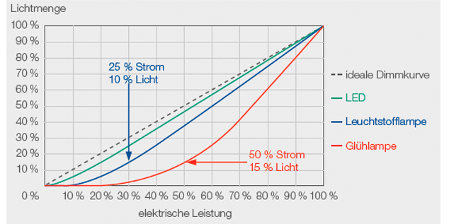 Das Verhältnis von elektrischer Leistung zur Lichtmenge ist bei keinem Leuchtmittel exakt proportional. Die Dimmkennlinie der LED kommt der idealen Kurve jedoch sehr nahe.