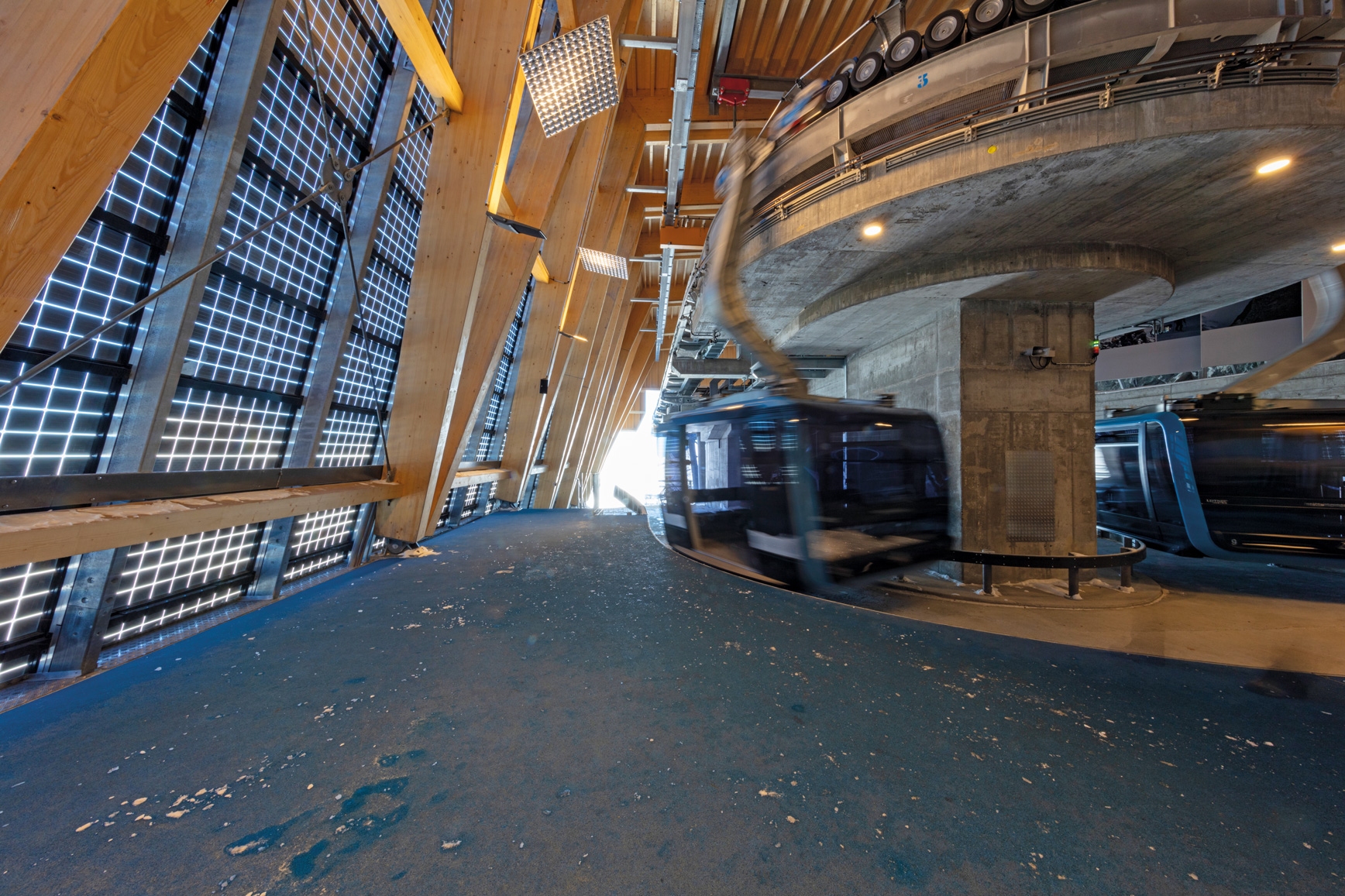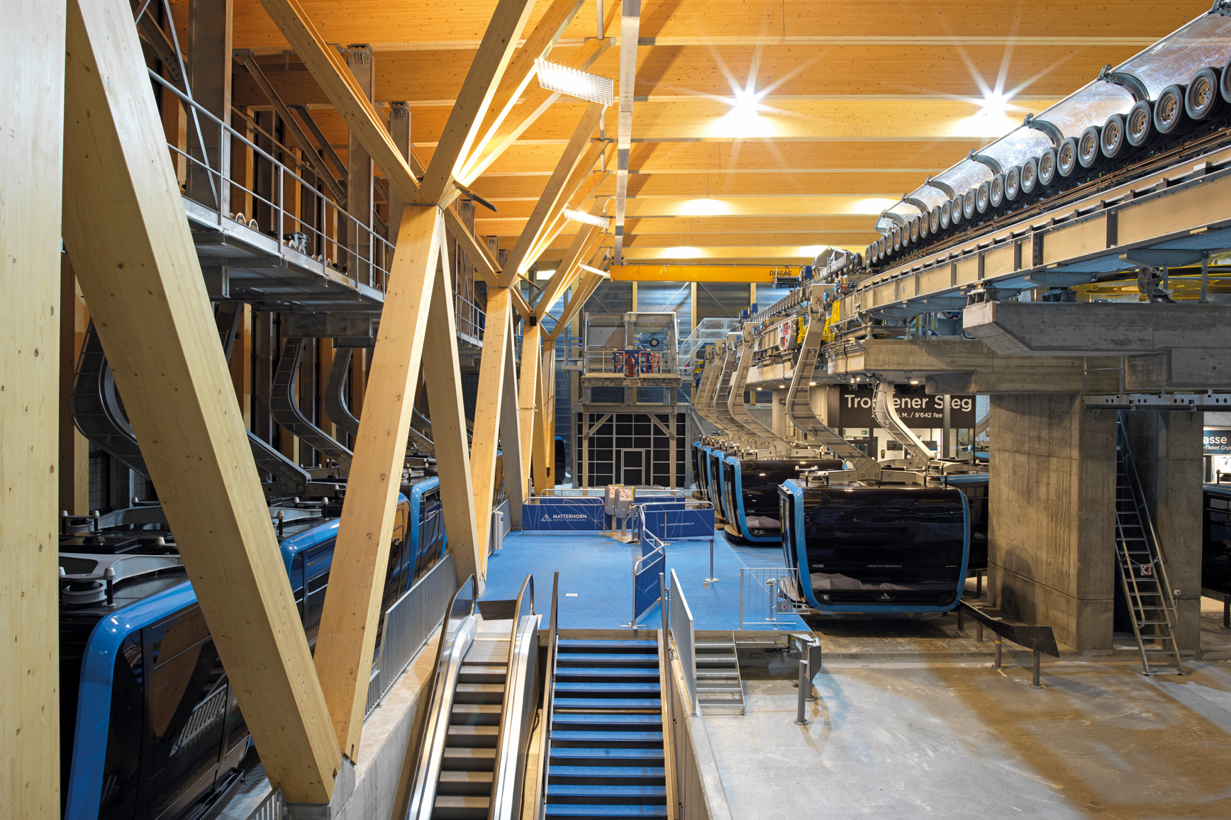 EM Licht plante und lieferte die Beleuchtung für die Tal- und Bergstation der neuen Seilbahn. Ob in der Gondelhalle, in den Kassenbereichen oder in den Technikräumen – zu den üblichen Anforderungen und individuellen Kundenwünschen aus architektonischer Sicht kamen wegen der grossen Höhe mit der möglichen extremen Kälte und bis zu 200 km/h starken Winden weniger häufige Herausforderungen hinzu. Schon die Talstation befindet sich auf einer Höhe von 2’939 m.