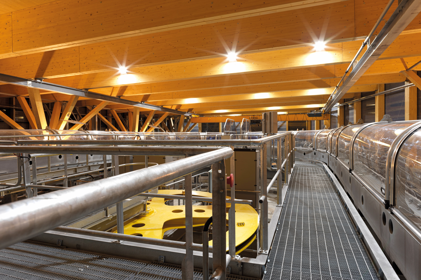 Stattdessen wurde der Einsatz von Spiegelwerfern geprüft, die sich gut in die Architektur integrieren und mit indirektem, angenehmem Licht überzeugen. «Gerade an dunklen Schlechtwettertagen spielt die Beleuchtung eine wichtige Rolle und das leicht goldene, gelbliche Licht der Reflektoren schafft in der Bergbahnstation die Illusion von Sonnenlicht», erklärt EM Licht Berater Yannick Tscherrig.