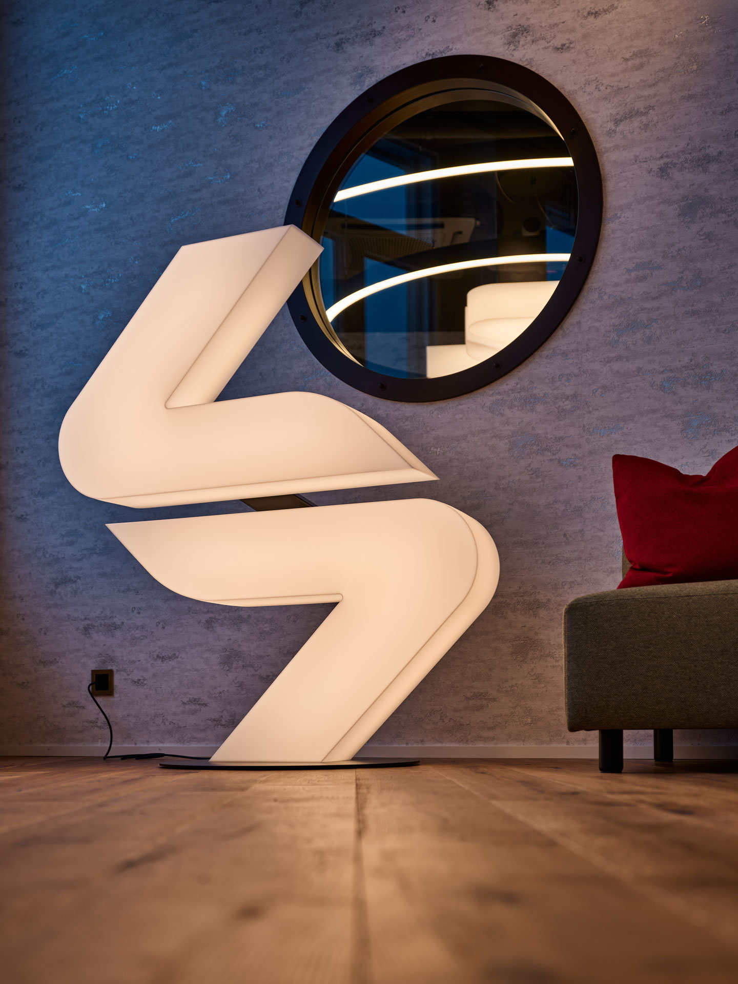 In enger Zusammenarbeit mit einem Leuchtenhersteller entwickelte Roger Gisler eine Stehleuchte in derselben Form wie das Firmenlogo. Der Hingucker in den Büros sorgte bei Martin Bissig für Begeisterung. Auch in den Pendelleuchten über den Arbeitsflächen findet sich das leuchtende Logo wieder und sorgt neben Helligkeit für Wiedererkennung und Branding.