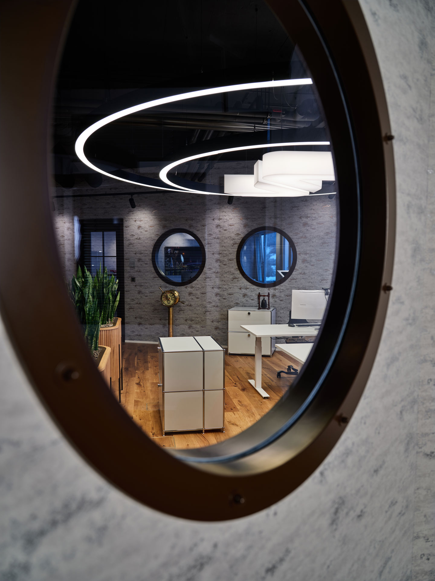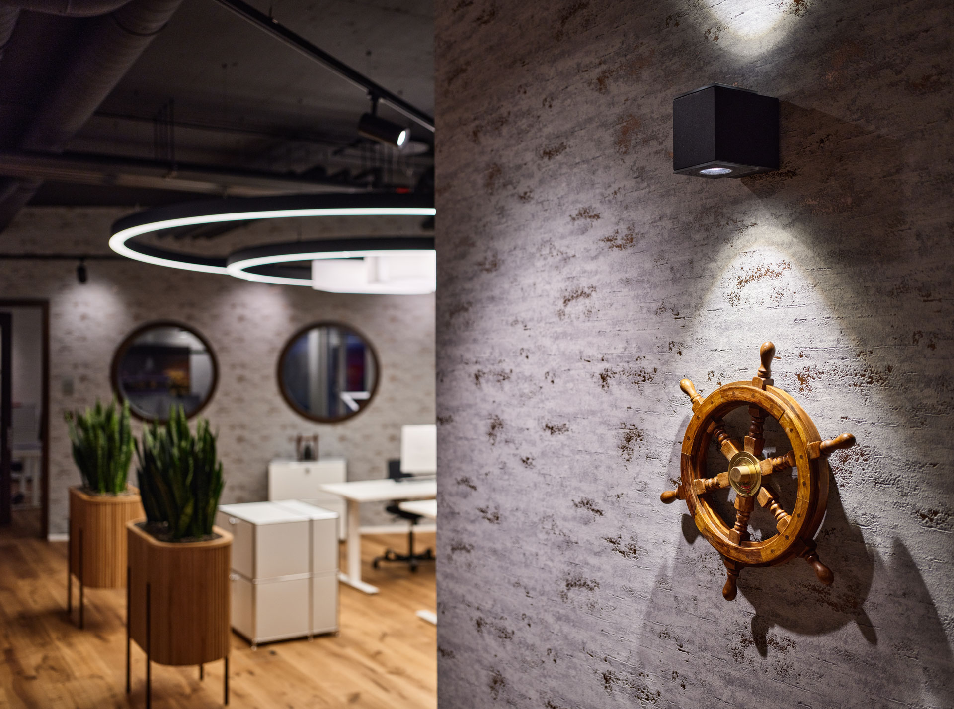Das neue Lichtkonzept integriert sich perfekt in die offen gestalteten Räumlichkeiten, die mit viel Glas, offenen Decken und charakteristischen Bullaugen den Charakter des Unternehmens widerspiegeln. Die Arbeitsplatzbeleuchtung besteht aus dimmbaren runden und ovalen Ringleuchten mit sehr guter Farbwidergabe (Ra 90) und hohem Sehkomfort. Filigrane Spotlights an abgependelten Stromschienen führen durch die Räume. Wandleuchten akzentuieren die Dekoelemente und betonen die Struktur der Wände.