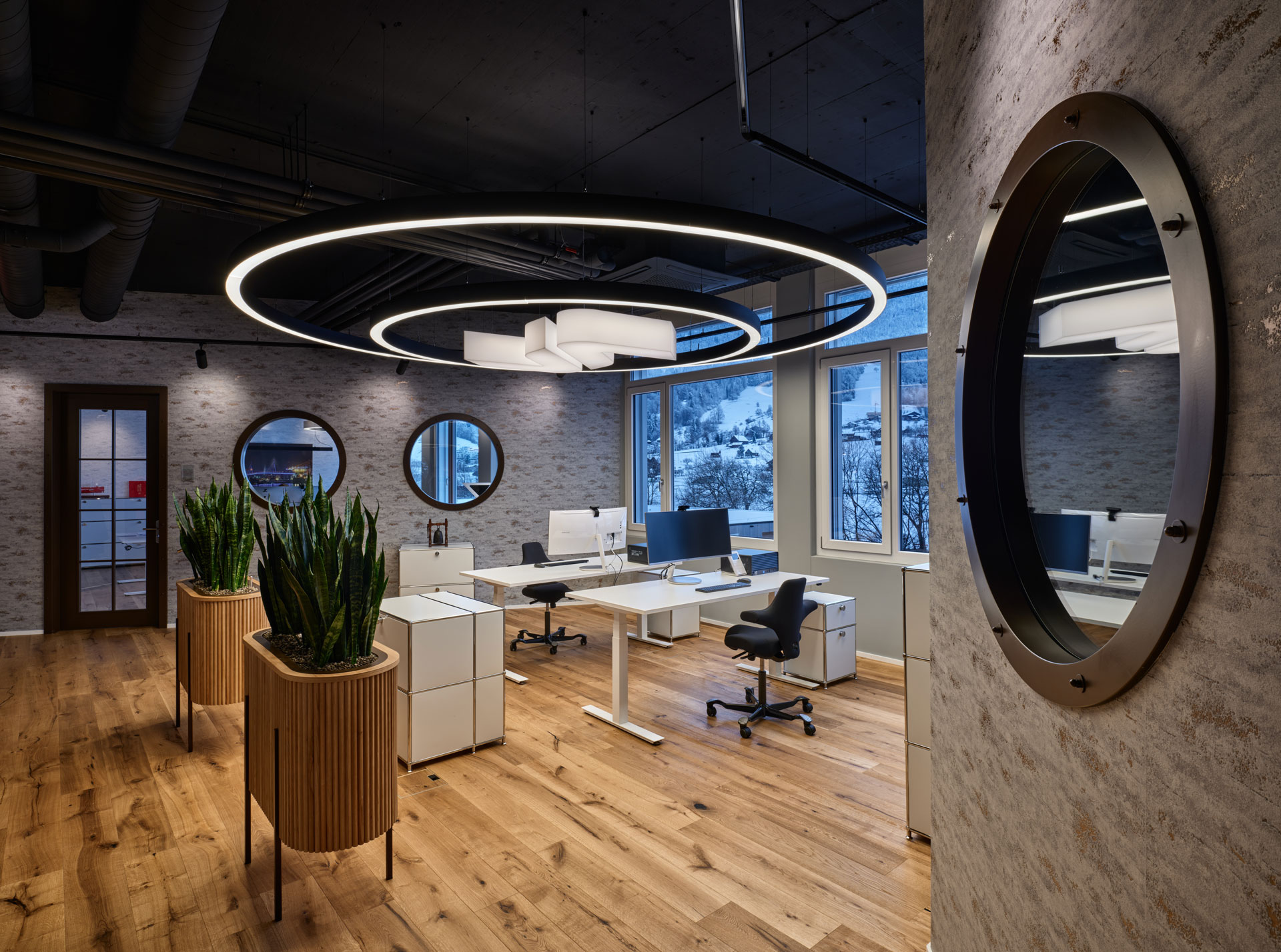 Das Beleuchtungskonzept für Sallaum Lines zeigt, wie beides optimal miteinander vereinbart werden kann. Der neue Firmensitz der Sallaum Lines Switzerland SA in Sarnen ist ein architektonisches Masterpiece. Am nördlichen Ende des Sarnersees gelegen, hat sich die achtgrösste Schifffahrtsgesellschaft der Welt ein innovatives und repräsentatives Büro geschaffen. Martin Bissig, CEO und Verwaltungsrat, wollte neue Massstäbe setzen. «Unser Unternehmen vereint Eleganz und Industrial Design – das möchten wir auch in unserem Firmensitz erlebbar machen.»