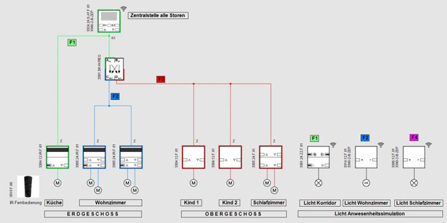 Betreffend Fernbedienung kann Markus dem Bauherren zwei Lösungen vorschlagen: Zum einen können alle Hauptstellen mit einem IR-Frontset versehen werden und mit einer IR-Fernbedienung von Feller bedient werden. Alternativ können die Hauptstellen mit einem WLAN Zwischenmodul versehen werden, das eine Steuerung per Smartphone-App ermöglicht. Die IR-Variante kann dabei kostengünstiger realisiert werden.