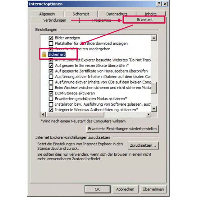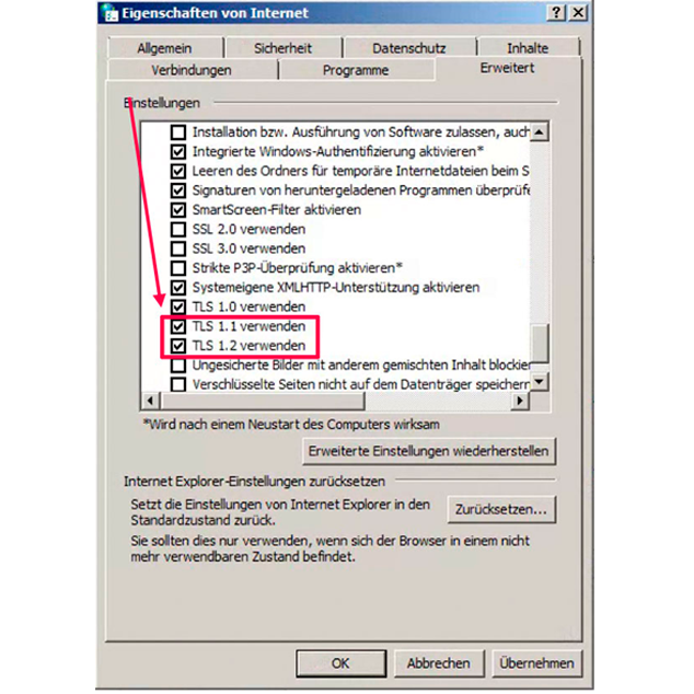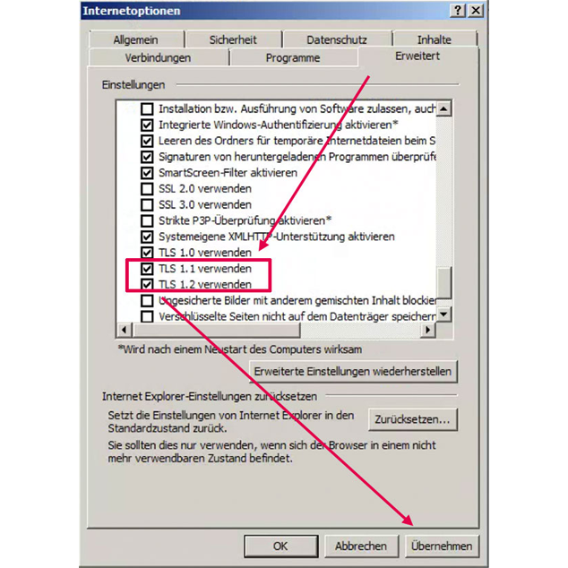 - Anschließend die Haken bei “TLS 1.1 aktivieren” und “TLS 1.2 aktivieren” setzen
