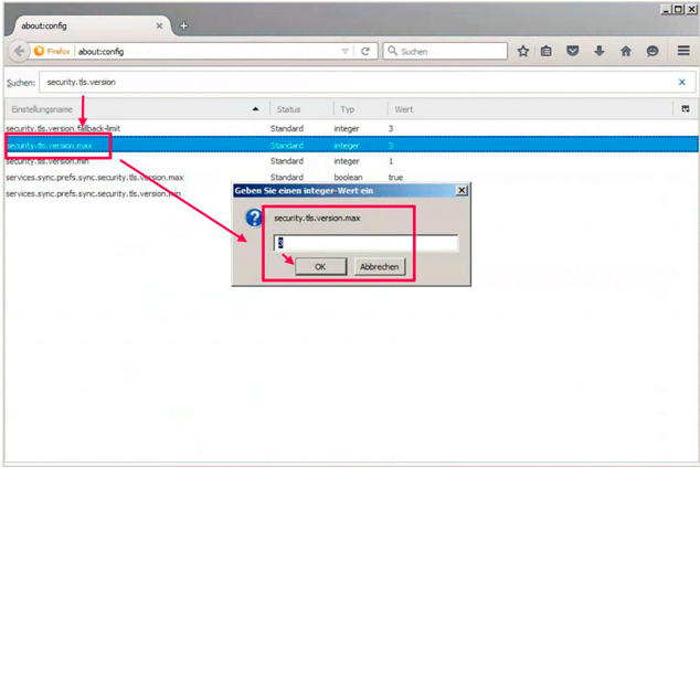 - Nun kann man bei security.tls.version.max eine drei eingeben, damit wird die maximal unterstützte Version des TSL-Standards auf 1.2 erhöht.