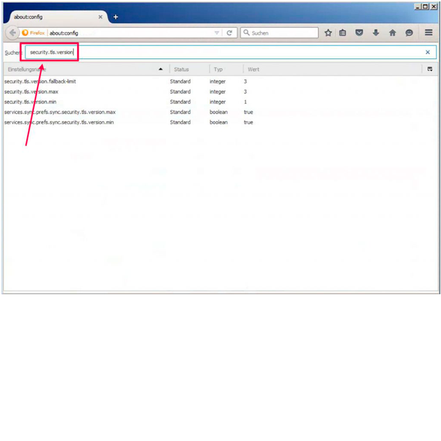 - In der Suchzeile nach dem Ausdruck security.tls.version suchen