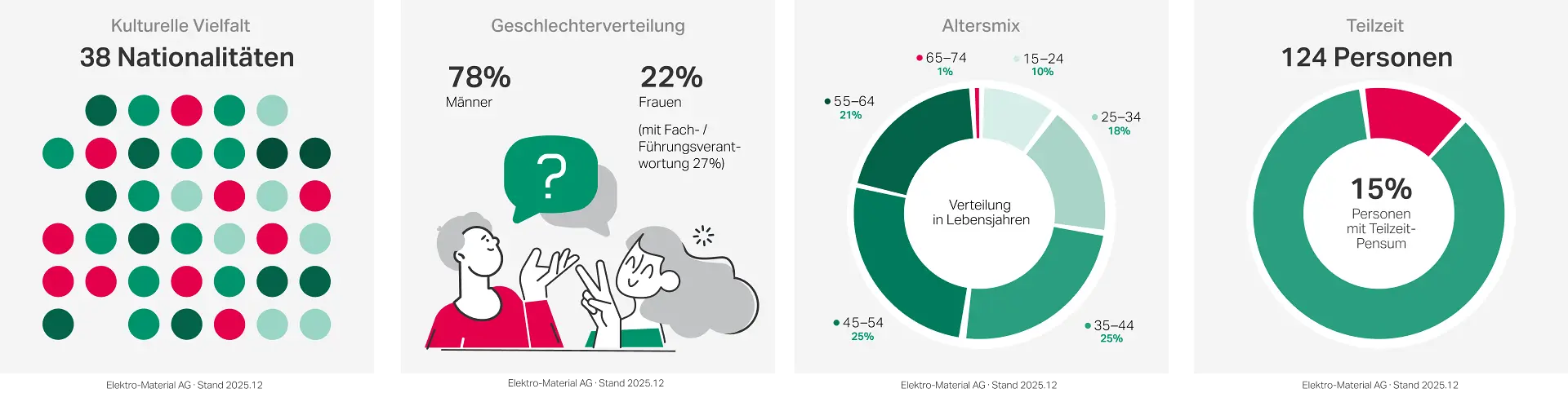 Unsere Belegschaft zeichnet sich durch eine grosse Vielfalt und gelebte Inklusion aus. So haben 35% unserer Mitarbeitenden einen Migrationshintergrund, was unsere Unternehmenskultur bereichert und unterschiedliche Perspektiven zusammenführt.