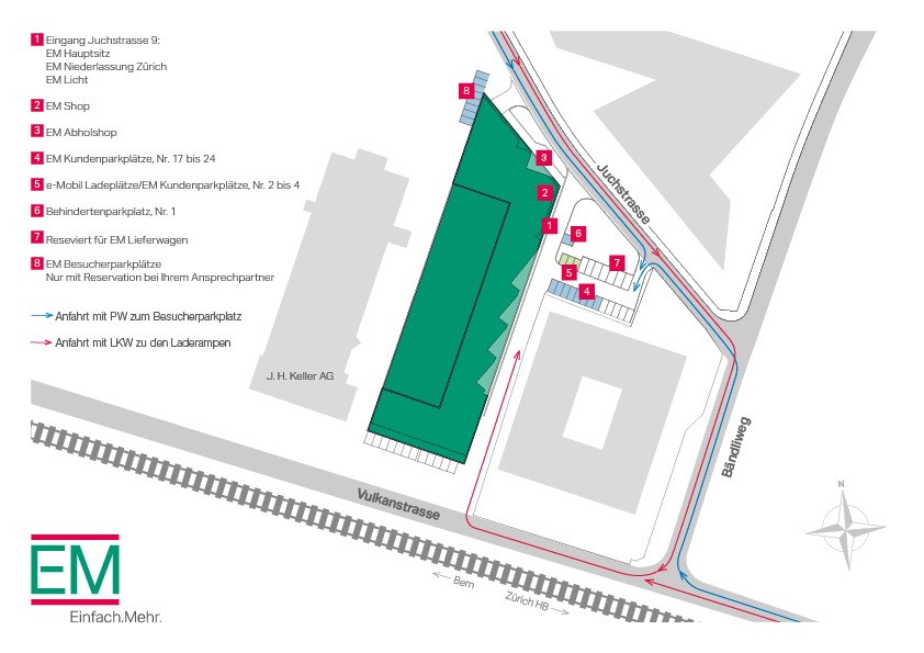 Ab Bahnhof Zürich-Altstetten, Ausgang  Richtung Nord, zu Fuss via Vulkanstrasse  in 9 Gehminuten am Ziel: Juchstrasse 9.
