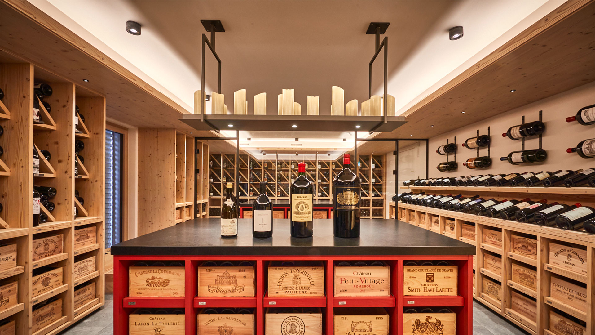 Im Weinkeller sorgt eine individuell angefertigte Pendelleuchte mit Kerzen für zusätzliche Stimmung. Die Decken in den Räumen bestehen aus unterschiedlichen Materialien. Die Einbauspots wurden in jedem Raum für ein möglichst harmonisches Gesamtbild farblich auf diese Materialien abgestimmt. Für die Zimmer wurden dekorative Wandleuchten gewählt: Sie unterstreichen die Architektur und schaffen ein heimeliges Ambiente.