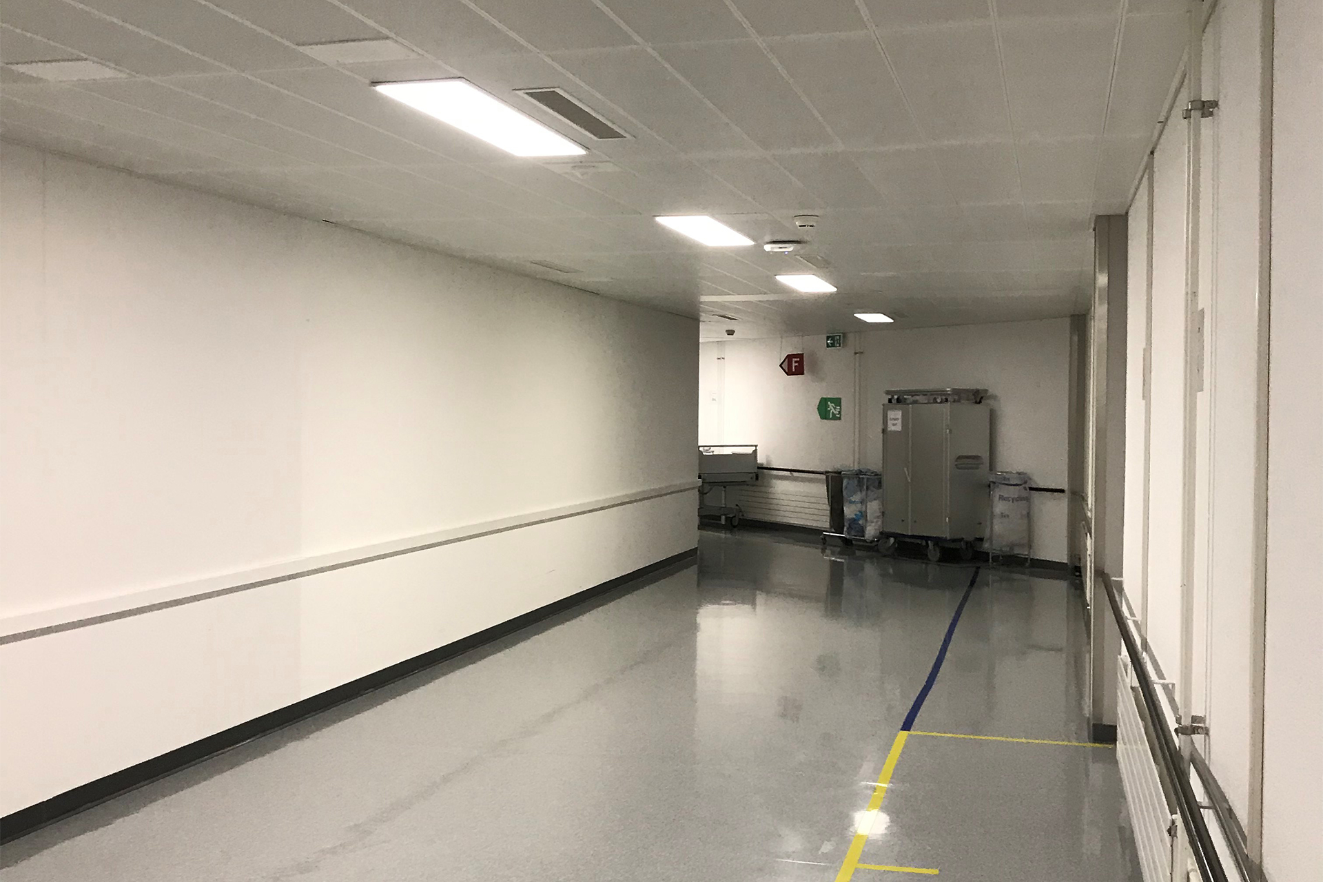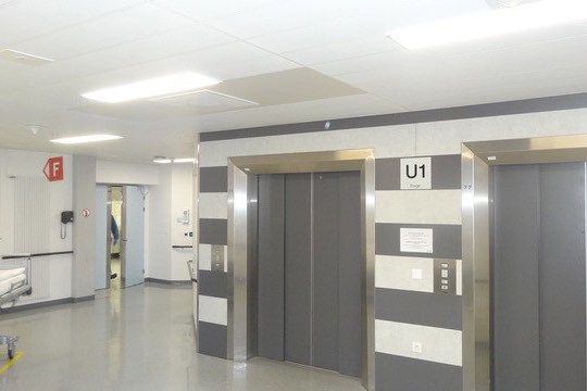 ​​​​​​​Sämtliche Korridore und Verkehrswege der Operationssäle, der Behandlungszimmer und der Neurologie wurden mit effizienten, blendungsarmen Lichtpanelen umgerüstet. Die helle und funktionale Beleuchtung wird durch Präsenzmelder mit Schwarm-Funktion betrieben. Dadurch sind sowohl der Energieverbrauch als auch der Wartungsaufwand massiv gesunken.