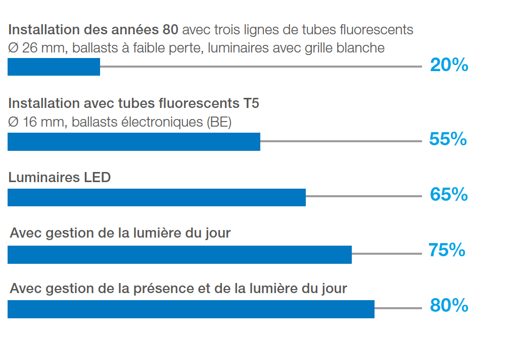 Il s’agit de miser sur des solutions d’éclairage efficaces en énergie. L’utilisation de luminaires LED augmente massivement le potentiel d’économie et ainsi la rentabilité. Si les luminaires sont aussi complétés par une gestion d’éclairage innovante, les économies peuvent atteindre 80%. De plus, grâce à la fiabilité et à la longue durée de vie caractérisant la technologie LED, on peut éviter de nombreux remplacements des sources lumineuses et réduire les frais de maintenance.