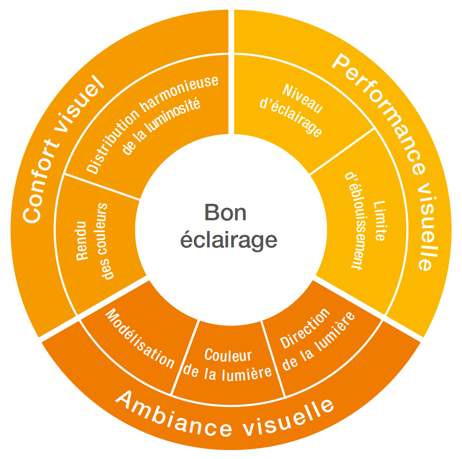 La lumière devrait être intégrée harmonieusement dans le concept global et former une certaine unité avec l’aménagement. Dans l’idéal, il faut tenir compte des critères d’un bon éclairage: luminosité suffisante, absence d’éblouissement, contrastes agréables et intéressants.