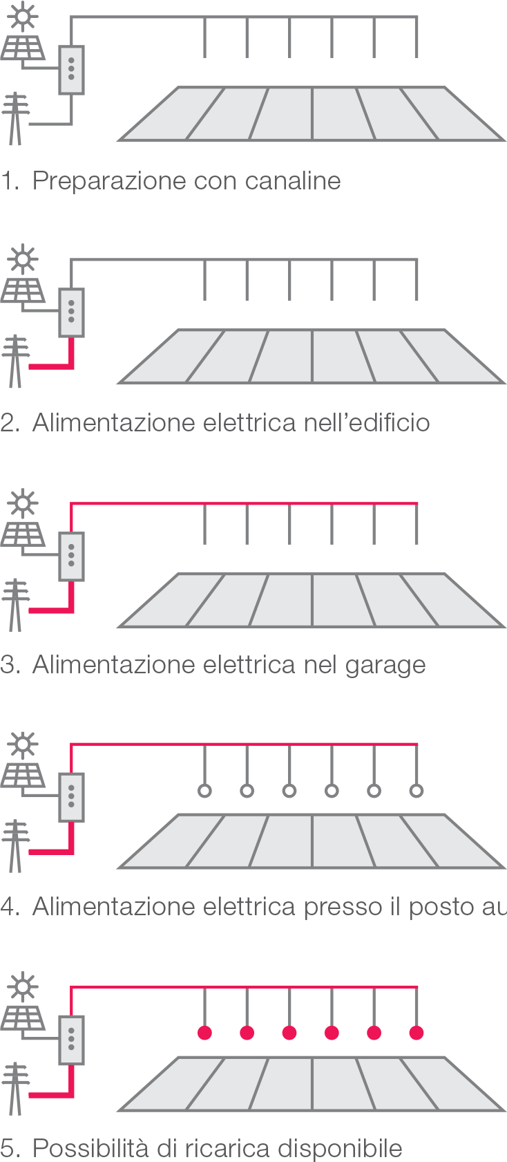 Nella progettazione di edifici si dovrebbe tenere conto dell’infrastruttura per la mobilità elettrica nelle fasi di attuazione. Si può facilmente adempiere alla fase 4 installando prese CEE16 nei garage/ garage sotterranei. Con tale preparazione, per la messa in funzione occorre solo l’infrastruttura di ricarica.