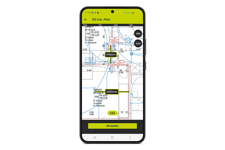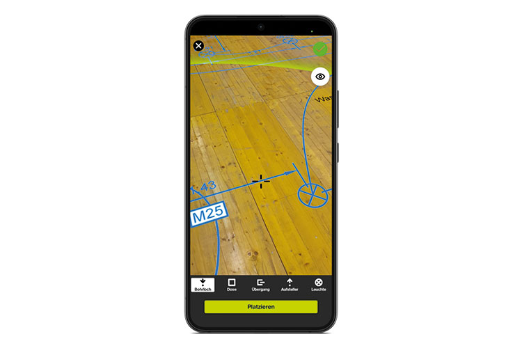 L’app può anche assistere l’installatore elettricista nella tracciatura: l’app ha due diverse modalità AR. Il metodo a un punto è destinato a processi di lavoro come la tracciatura dei fori di perforazione e delle protezioni delle casseforme nella costruzione di abitazioni tradizionali e case unifamiliari. La deviazione aumenta con l’aumentare della distanza dal punto di riferimento. Per evitare questo inconveniente, la pianta deve essere adattata alle pareti sottostanti. Non è necessario riavviare la modalità AR. Il metodo a un punto viene utilizzato anche per verificare la posizione e la completezza e può essere applicato anche a superfici verticali come la parete della cucina.