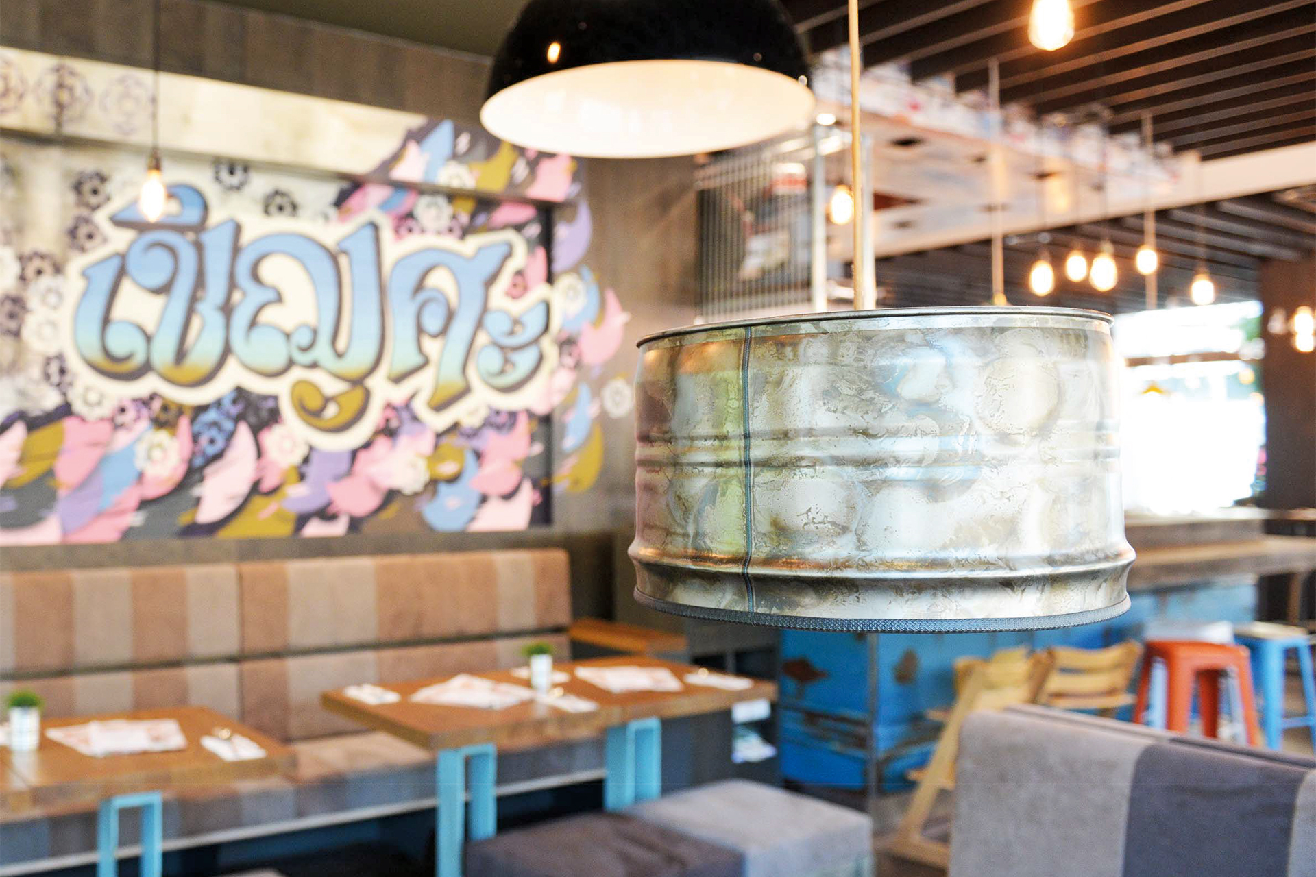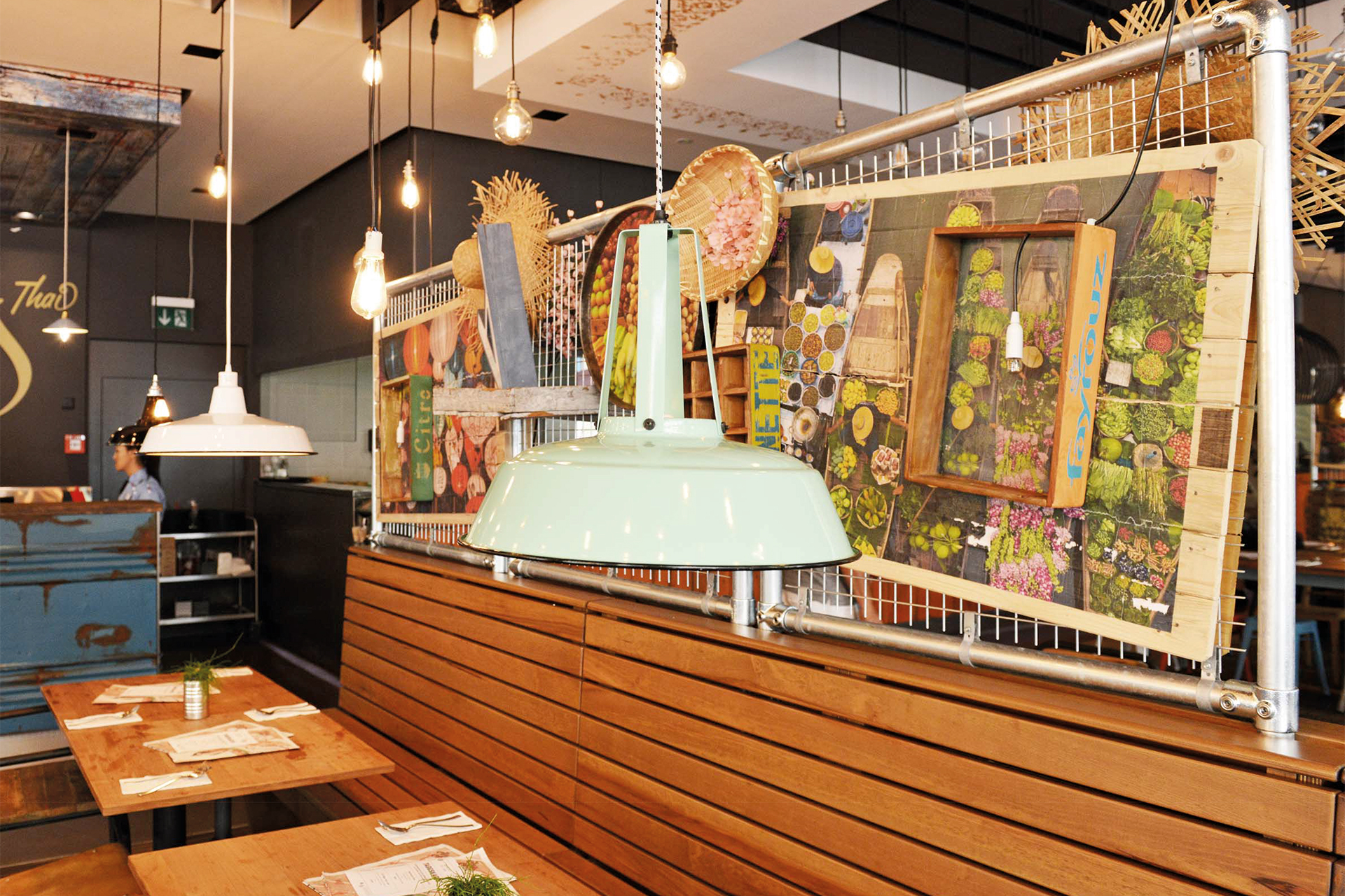 «Thailen und verweilen», condividere e stare insieme è il motto di Cha Cha Thai. Insieme all’architetto d’interni abbiamo sviluppato un sistema d’illuminazione coerente: le molte lampade diverse intendono ricreare lo stile d’illuminazione semplice della Thailandia. Per rafforzare questa impressione sono state utilizzate alcune lampade vintage con la vernice in parte scheggiata o su cui emergono le prime macchie di ruggine.